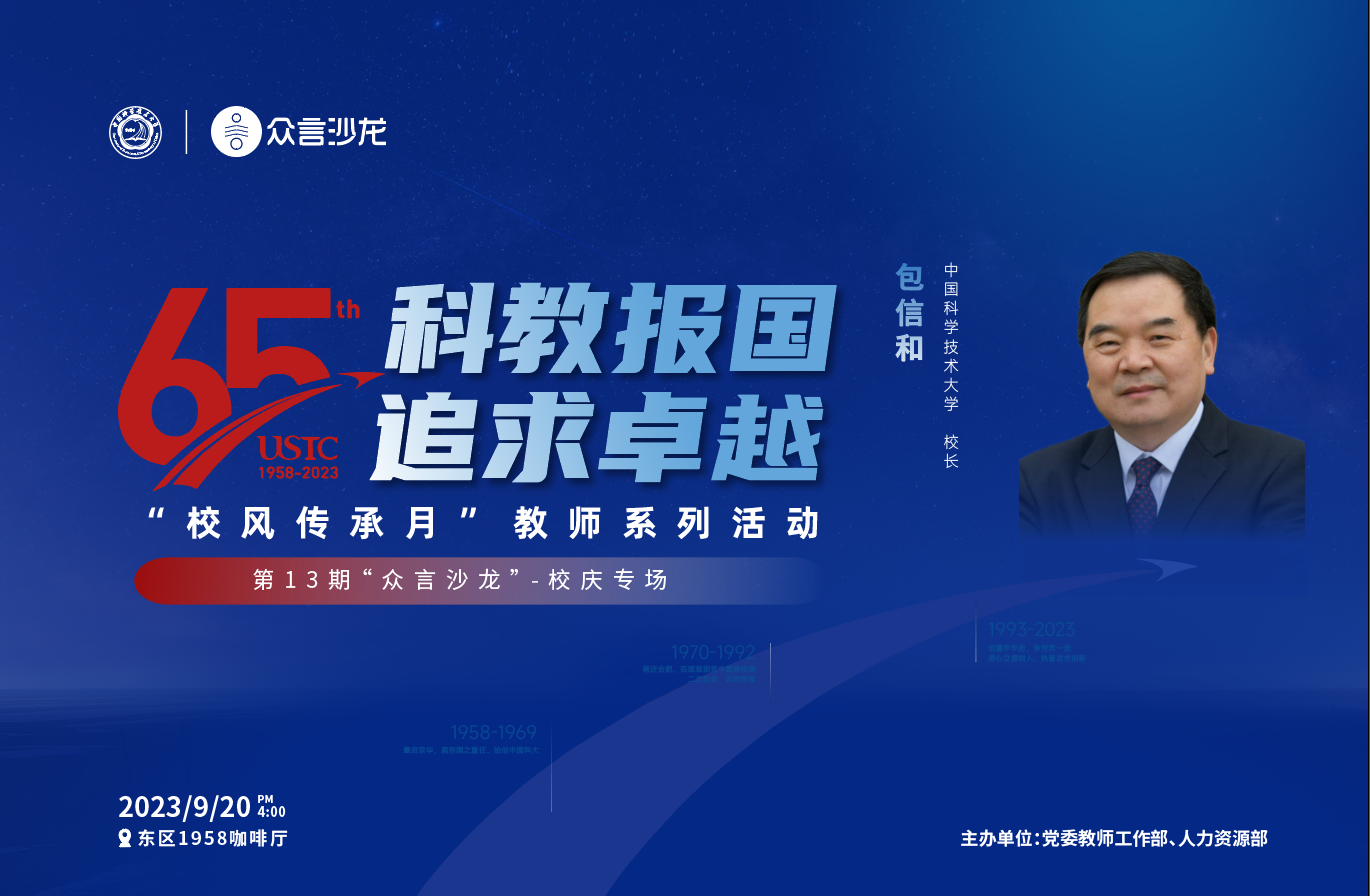 9月20日是中国科大建校65周年校庆日,作为天启网投校风传承月教师系列活动之一,第13期众言沙龙将以“科教报国,追求卓越”为主题举办校庆专场活动,邀请校长包信和作为嘉宾,与教职工代表进行面对面交流。