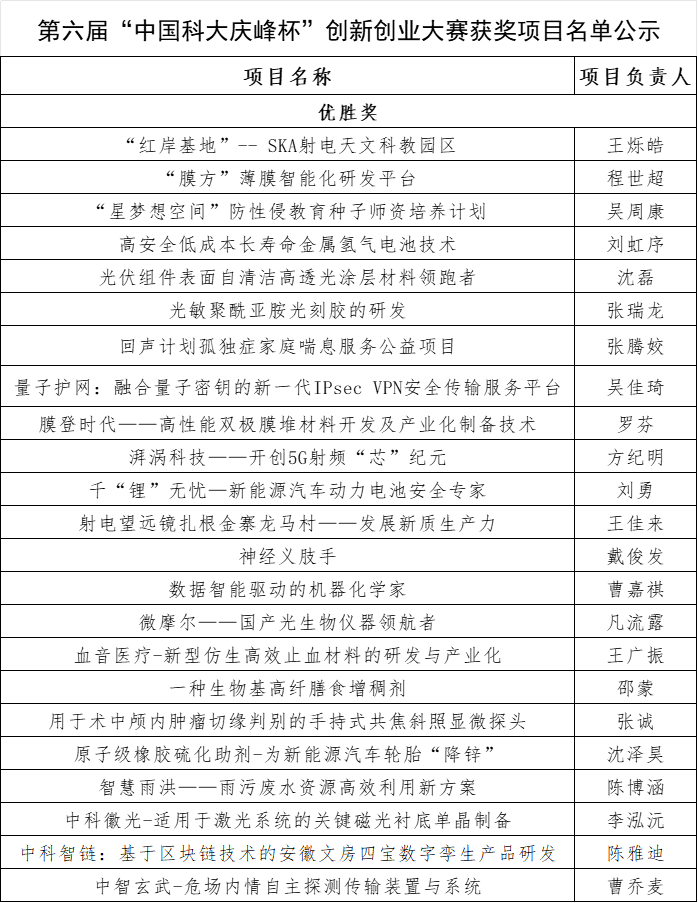 5月19日,第六届“中国科大庆峰杯”创新创业大赛决赛成功举行。经资格审查、初赛复赛、决赛路演答辩及专家评审合议等环节,现将本届大赛获奖项目公示如下(同等奖项排名不分先后,按项目名称首字母排序):