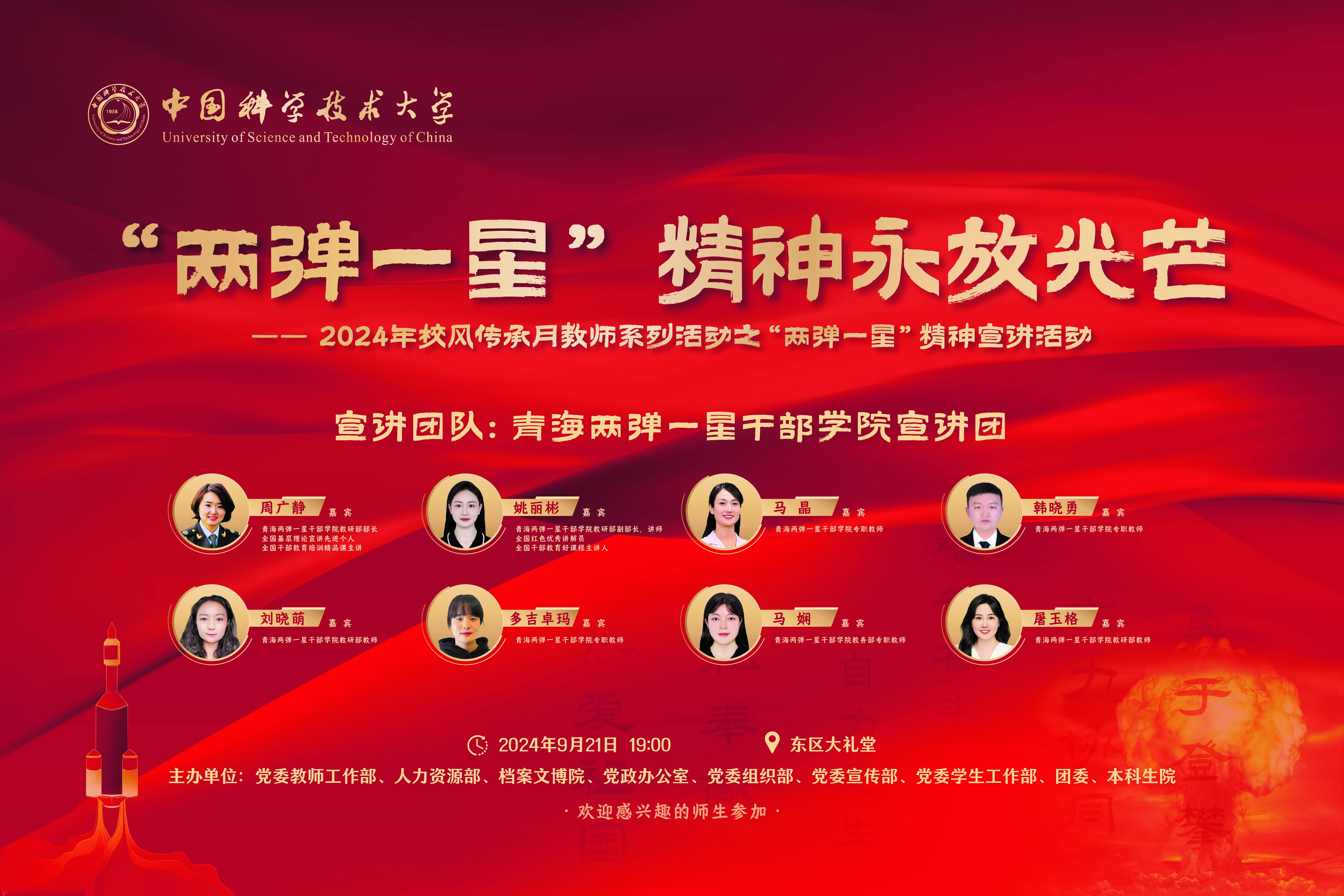 二、学校定于9月21日(周六)晚上19:00,在东区大礼堂举行《“两弹一星”精神永放光芒》宣讲演出