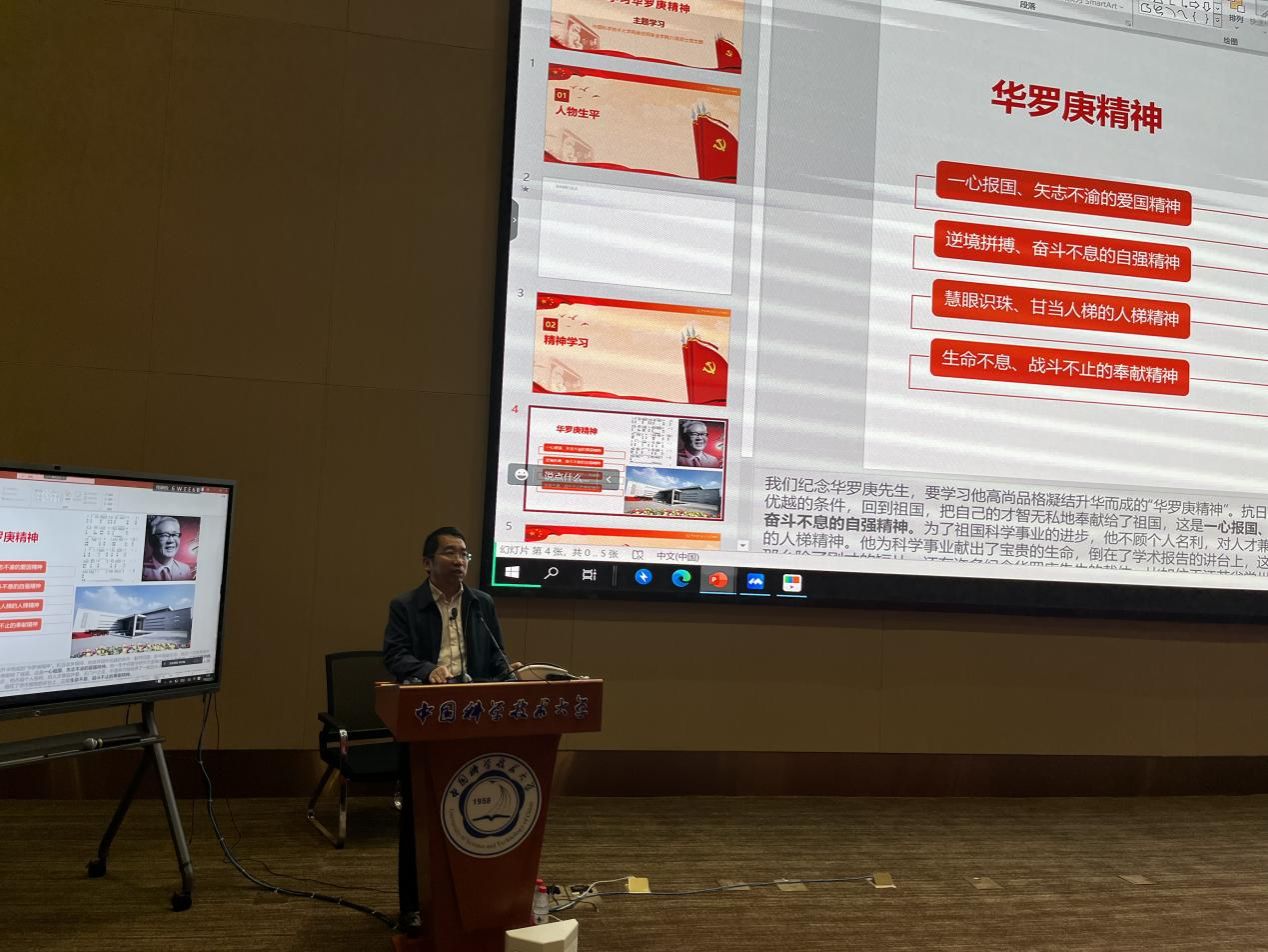 党总支书记谭勇强调了学习习近平总书记关于理想信念的重要论述,要大力传承和弘扬好伟大的“两弹一星”精神和科学家精神,结合“培养担当民族复兴大任的时代新人”目标,做一名热爱祖国、勇于奉献的人,做一名刻苦求学、勇攀高峰的人,做一名无愧于这个时代的中国青年。三名党员代表分别带领大家学习了郭沫若、华罗庚、曾肯成三位老科学家的事迹,鼓励与会全体坚定理想信念,传承科学家精神。