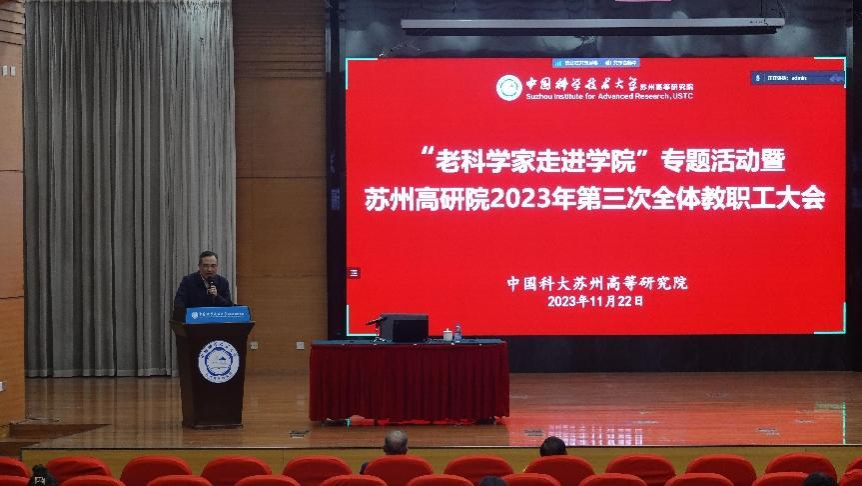 为深入学习贯彻落实党的二十大精神,重温习近平总书记对科大的重要指示批示精神,引导广大师生赓续科大精神,传承优良校风,11月22日下午,苏州高研院党委与学校关心下一代工作委员会以及离退休干部党委联合举办“老科学家走进学院”专题活动,邀请到化学系郭庆祥教授作专题报告。活动由苏州高研院党委常务副书记、副院长屠兢主持,苏州高研院在苏党政领导班子成员、院内各单位340余名在苏教职工及学生代表参加活动。