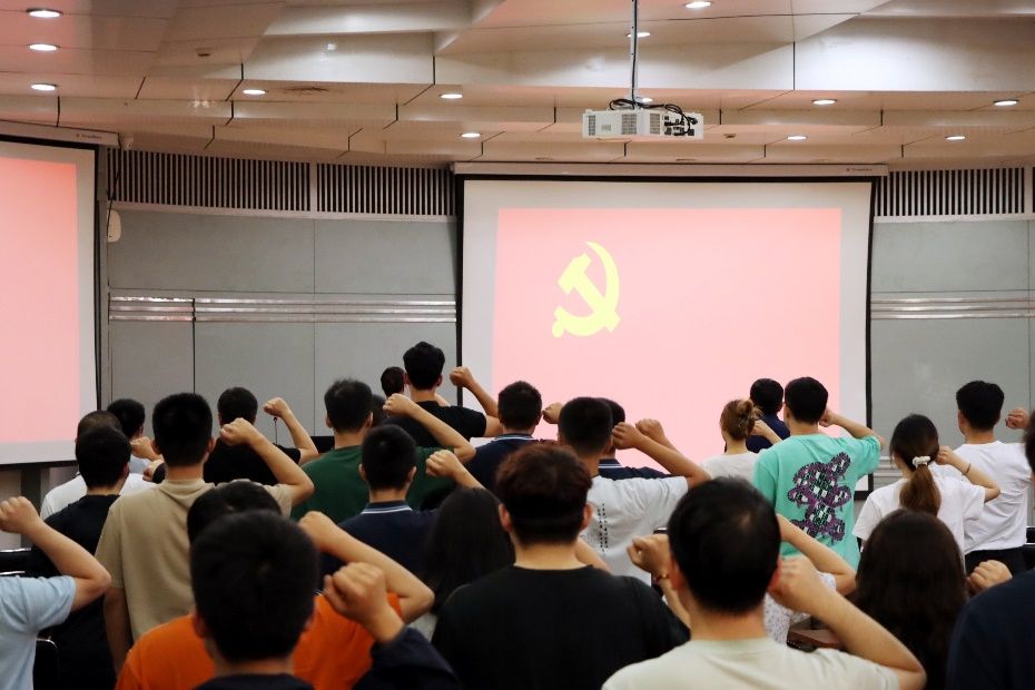 会议最后,由学院党委副书记牟玲领誓,全体新党员面对党旗庄严宣誓,现场老党员重温入党誓词。“我志愿加入中国共产党……”一句句誓词铿锵有力,震撼心灵,催人奋进。