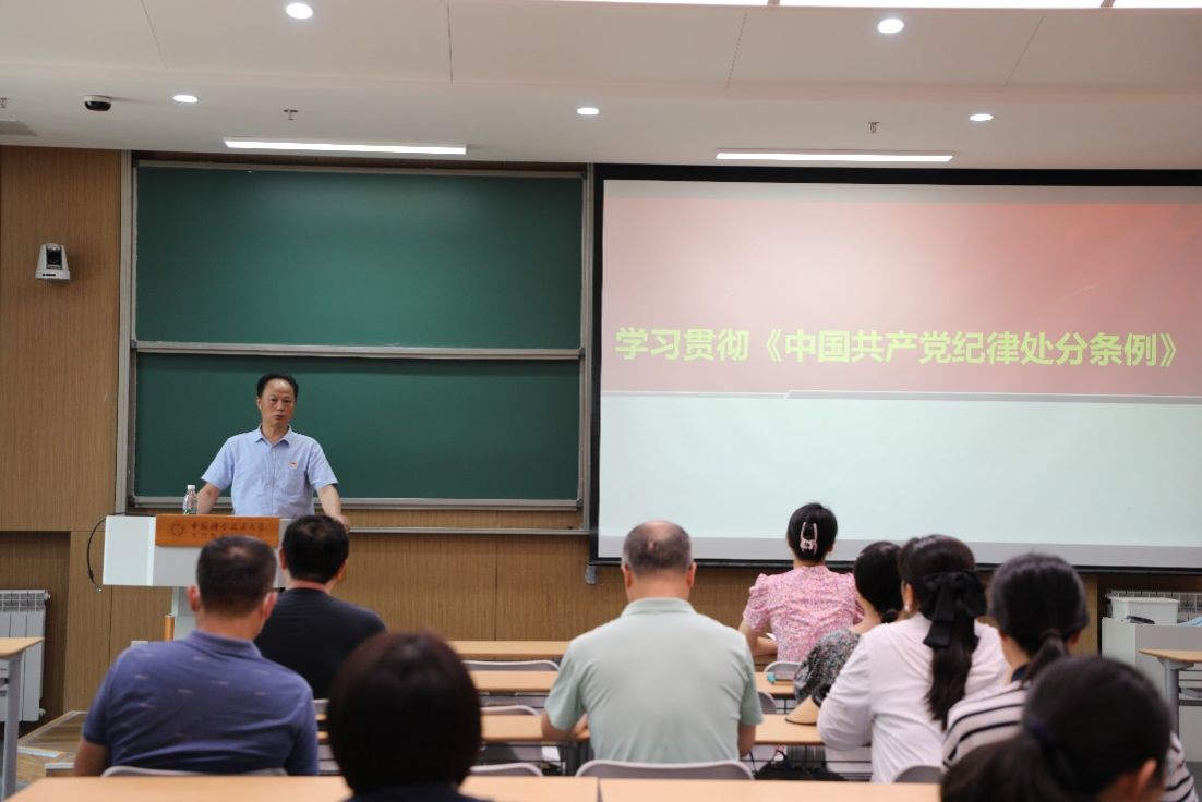 6月12日下午,公共事务学院党委书记丁望斌以学习贯彻《中国共产党纪律处分条例》为题,在5107教室为学院教工党员讲授党纪学习教育专题党课。