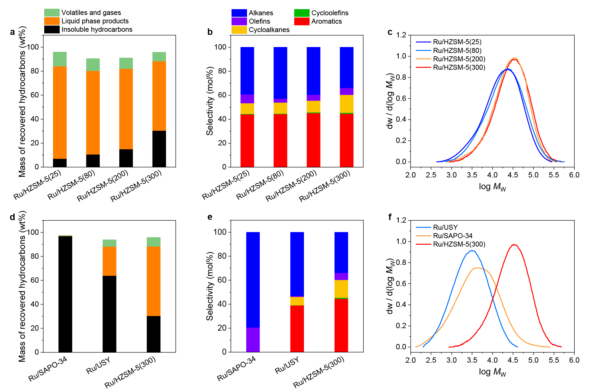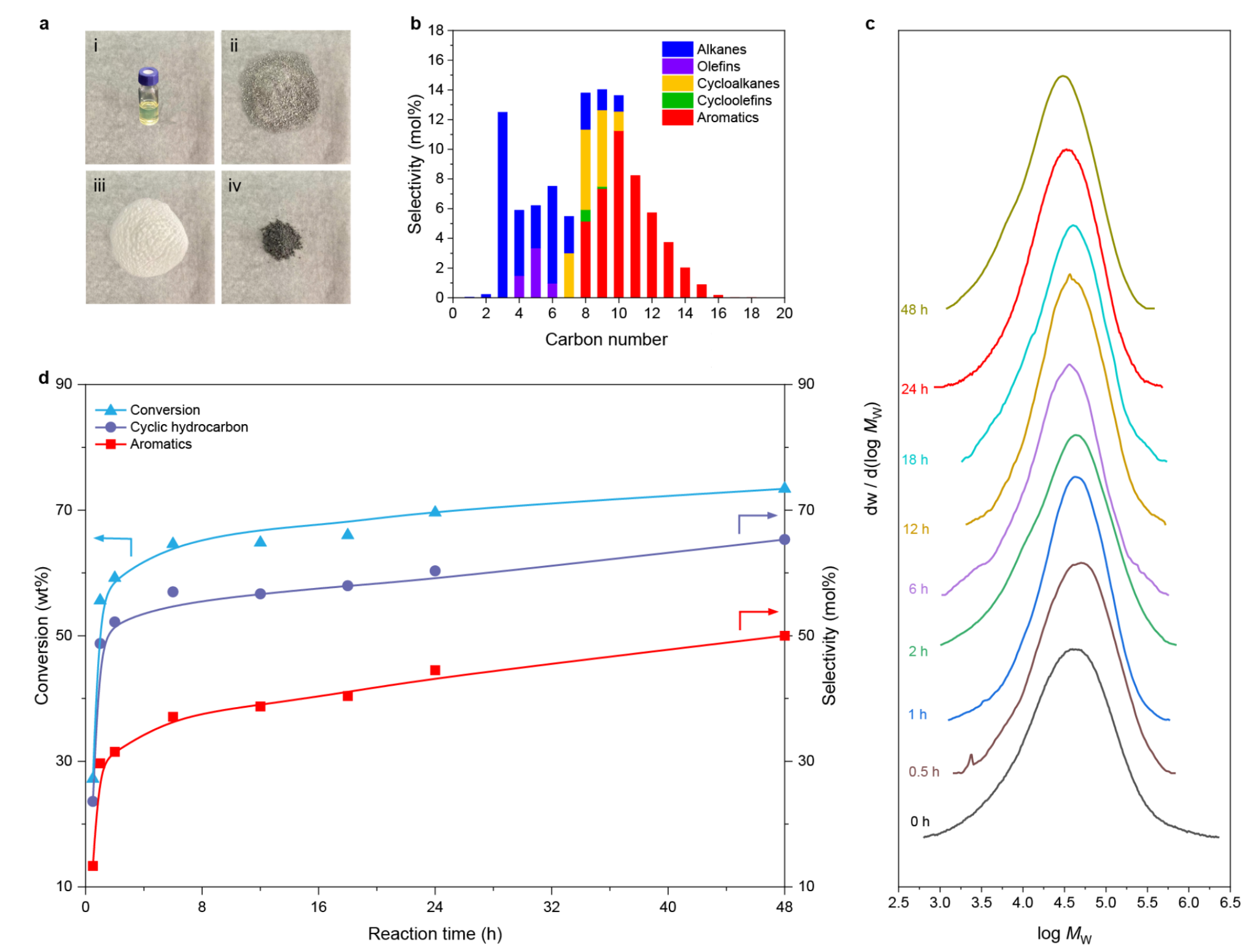 在无需额外添加氢气或溶剂的条件下,研究人员实现了高密度聚乙烯塑料到环状烃的循环升级。具体来讲,在Ru/HZSM-5催化剂的作用下,经280摄氏度24小时的催化反应,高密度聚乙烯塑料的转化率达到69.6 wt%(图1)。产物中链状烃主要分布在C1-C6,环状烃主要分布在C7-C16,且环状烃的选择性为60.3 mol%。