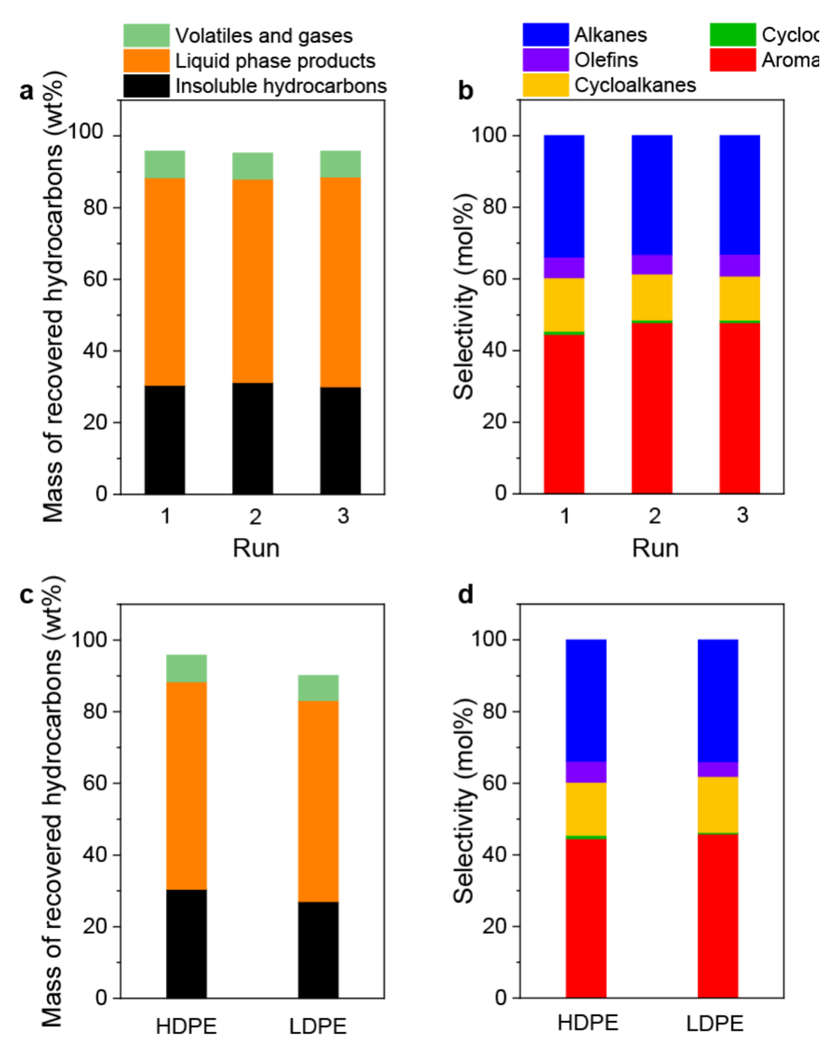 经过三轮催化反应,Ru/HZSM-5催化剂的活性和选择性都没有发生明显变化,说明该催化剂具有很好的循环稳定性。同时,研究人员将原料从高密度聚乙烯塑料粉末更换为低密度聚乙烯保鲜膜,并进行了相同条件下的催化实验。结果表明,低密度聚乙烯保鲜膜也能被高效降解,且产物选择性跟高密度聚乙烯塑料几乎一致。这些结果表明,Ru/HZSM-5催化剂对不同类型的聚乙烯塑料具有一定的普适性。
