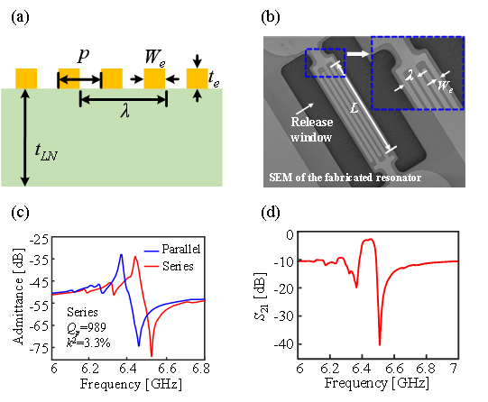 图1、S1高频无杂散声波器件(a)谐振器截面示意图,(b)谐振器SEM图像,(c)谐振器测试导纳曲线,(d)测试所得滤波器传输特性
