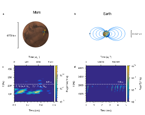 图1.火星和地球上的磁力线位型以及观测到的合声波频率-时间谱图。