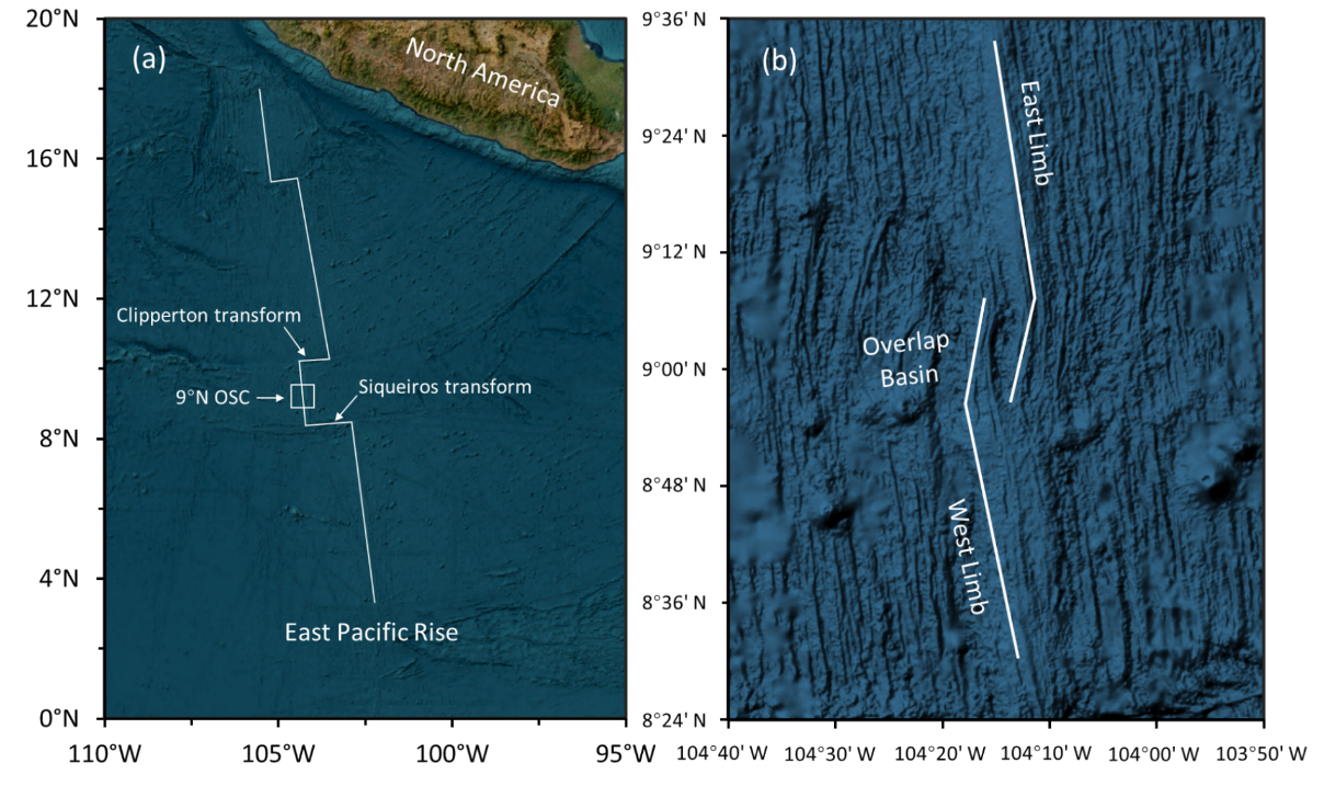 图1(a)东太平洋洋隆(EPR)北部的地理位置图。文中所测试的岩浆岩样品均来自EPR 9°50′N和重叠扩张中心(9°N OSC) (b)东太平洋洋隆(EPR)重叠扩张中心的具体构造图,包括东侧的伸展分支、西侧的后退分支以及被两分支环绕的中心重叠盆地。