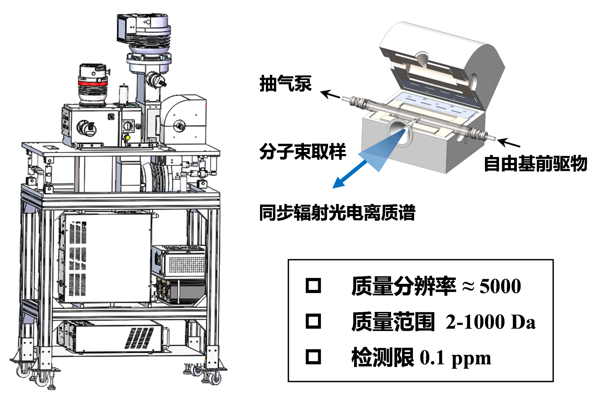 图1. 国家同步辐射实验室原子与分子物理线站搭建的用于研究气相分子反应的同步辐射真空紫外光电离质谱实验平台。