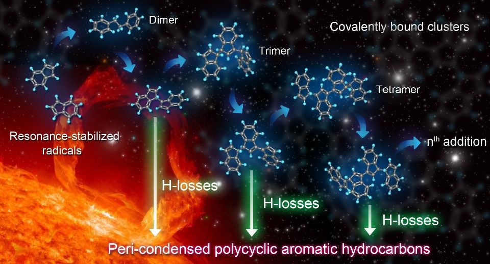 实验中观测到一系列有规律增长的共价团簇中间体。结合量化计算,发现氢原子提取和多次RSR加成推动了共价团簇的形成和快速增长(图2)。这些团簇逐步脱氢产生大尺寸的peri-condensed缩合芳烃和多环芳烃自由基,并且形成白色烟雾状的碳质颗粒。这种共价团簇逐步脱氢机制(PHLCBC)阐明了共振稳定自由基、共价团簇和peri-condensed缩合芳烃之间的重要关系,桥接了小尺寸气相自由基中间体与大尺寸纳米碳颗粒(图3)。该研究有望为碳质颗粒物多尺度模拟提供重要思路,并指导碳质纳米材料的合成、揭示火焰中富勒烯团簇的形成机制和新型结焦抑制剂的开发等。