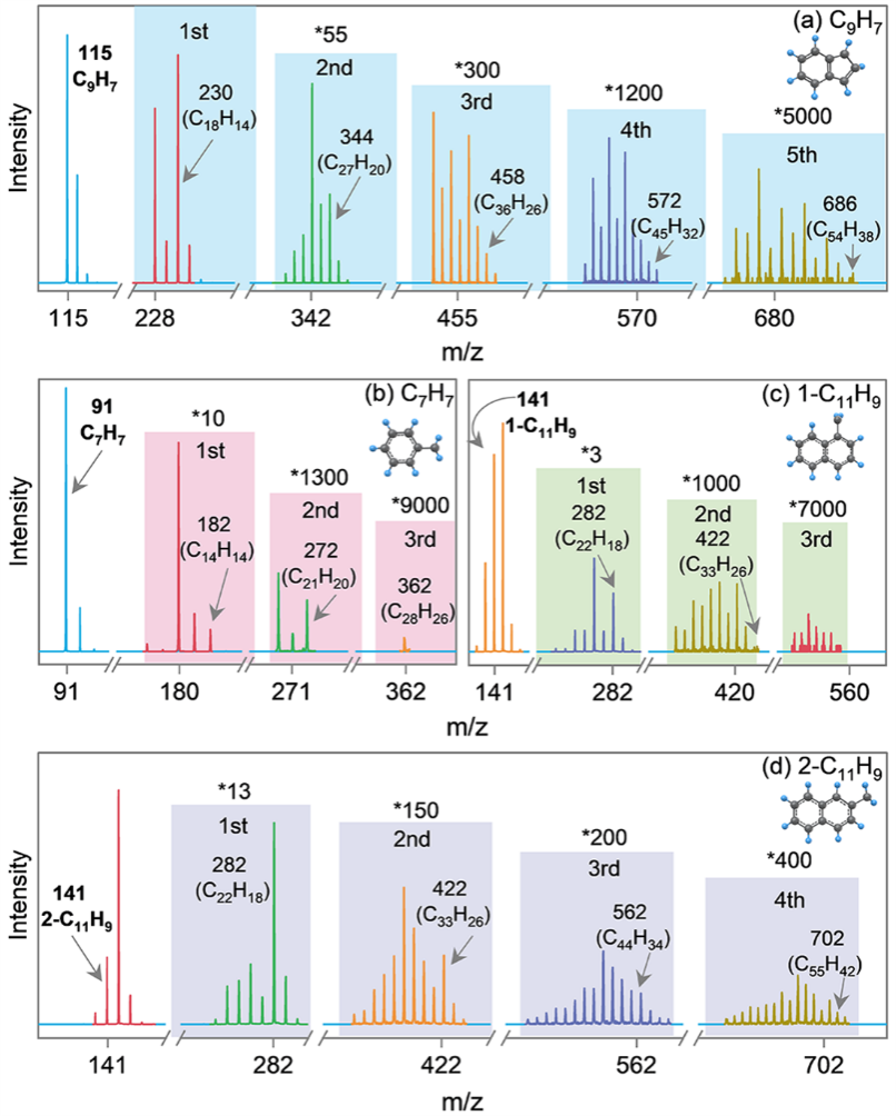 图2. 实验探测到的RSR自由基反应产生的共价团簇及演化产物。