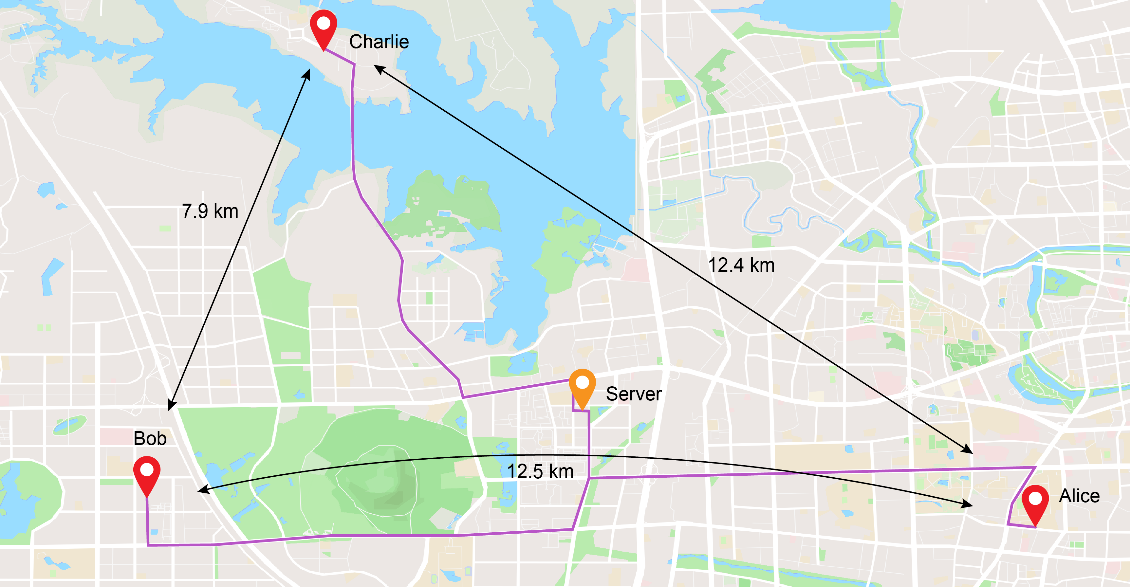 图:实验节点布局示意图。其中Alice节点位于中国科大东区、Bob节点位于合肥创新产业园、Charlie节点位于安徽光机所。