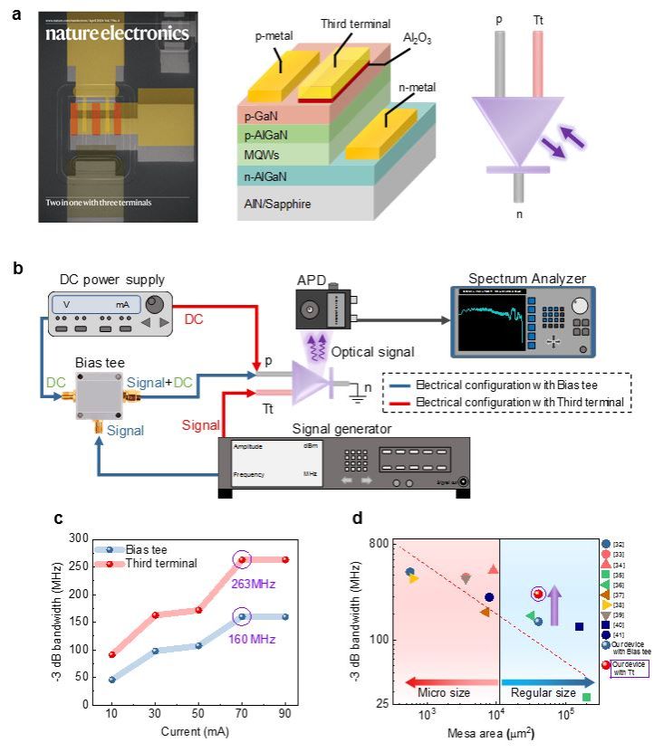 图1(a)文章封面、三电极发光和探测二极管的结构示意图和对应的新器件符号;(b)三电极LED的带宽测试装置示意图,蓝线代表带有外部偏置器系统配置,红线代表只使用三电极LED的系统配置;(c)不同电流条件下的-3 dB带宽;(d)将三电极LED应用在光通信系统中的调制带宽相较于其他报道的同类型LED性能对比图。