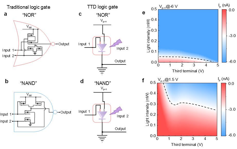 图2(a)传统的NOR逻辑门(b)传统的NAND逻辑门;(c)基于三电极二极管的NOR门在单个器件内实现相同功能;(d)基于三电极二极管的NAND门在单个器件内实现相同的功能;(e)在-6 V偏置条件(p-n-电极)下,光电流对输入光强和三电极电压的依赖性,对应“NOR”逻辑门条件;(f)在1.5 V偏置条件(p-n-电极)下,光电流对输入光强和三电极电压的依赖性,对应“NAND”逻辑门条件。
