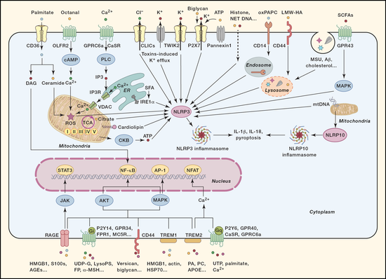 DAMP通过作用于危险感应受体以活化炎症信号通,因此,在DAMP介导炎症反应的过程中,危险感应受体是非常关键的环节。起初,科学家发现负责识别病原相关分子模式(PAMP)的模式识别受体(PRR)也可以识别DAMP,例如:Toll样受体可以识别HMGB1,microRNA等;C型凝集素受体可识别聚糖、SAP130、F-actin;RIG-I样受体可识别内源的RNA;DNA感受器识别内源DNA。NLRP3是NOD样受体家族的成员,可以感应和识别多种DAMP分子,包括氧化的线粒体DNA、组蛋白、离子流动、脂代谢产物、结晶、蛋白斑块等,介导炎症小体活化。这些模式识别受体的活化将引发下游信号通路的活化,产生IL-6、IL-1β、I-IFN等细胞因子,促进神经退行性疾病、代谢性疾病、肿瘤等疾病的发生和发展。随着近年来学界对危险感应受体的深入研究,一些新的受体,例如GPCR、ZBP1等,也被发现可以作为危险感应受体识别DAMP并介导炎症反应,同样也在一系列重大疾病中扮演重要角色。