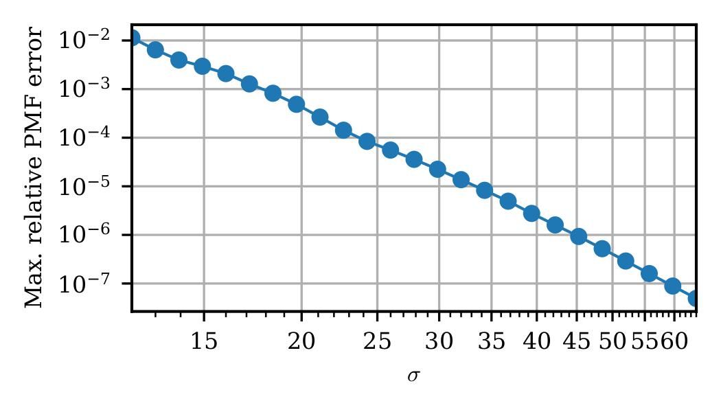 图 1 理论输出范围达到±14σ的生成器的相对概率误差与随机数大小的关系