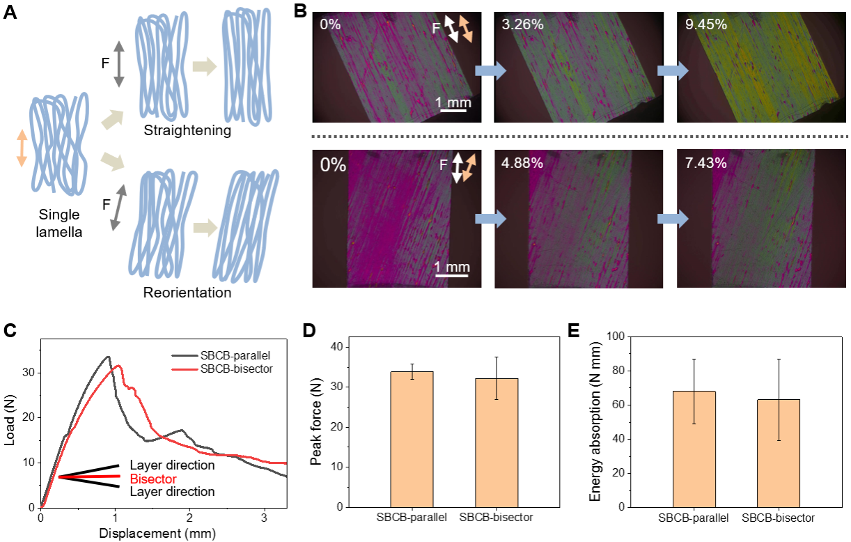 图2.联用偏振光-力学加载技术实时监测纳米纤维基元微运动与多尺度各向同性仿生半有序布利冈结构对拉载方向的不敏感性