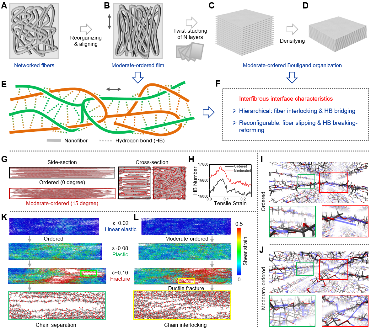 纳米纤维的空间取向度是决定其排列方式的关键因素,通过合理设计纤维的空间排列方式以调控纤维间的分子尺度相互作用有助于优化界面的变形模式和荷载传递能力。研究人员以富含羟基的网络态细菌纤维素纳米纤维为模型基元,单轴牵伸其凝胶膜以诱导纳米纤维基元取向并同时缩小基元间距,然而实验上难以获知取向度对纤维网络微观力学行为的影响机制。鉴于此,研究人员进行了基于不同取向角度纤维模型的大规模分子动力学模拟(图1)。结果表明,通过引入空间取向度产生的贯穿连锁结构可以优化氢键网络的维度。三维氢键网络的空间桥接效应不仅增强了纤维体系的荷载传递能力和抵抗破坏稳定性,而且通过在塑性变形阶段引入更多的氢键断裂-重构行为以促进能量耗散。半有序模型的贯穿连锁体系促成了临界断面上纤维素分子链的桥接互锁作用,相比完全有序模型临界断面上纤维素分子链的横向直接分离,半有序模型展现出更加坚固的韧性断面。然而,过大的取向角度会削弱荷载沿拉伸主轴的传递效率和链间氢键密度,导致整体力学性能的下降。这种相互对立的影响机制说明适度有序(半有序)的纤维排列方式可以获得最佳的纤维间界面作用,从而优化体系的力学性能。半有序设计理念是基于微观结构和氢键作用两方面的协同作用结果,完全有序设计并不对应体系最优的力学性质,这反映了结构取向、纤维互锁和氢键网络维度之间的权衡。