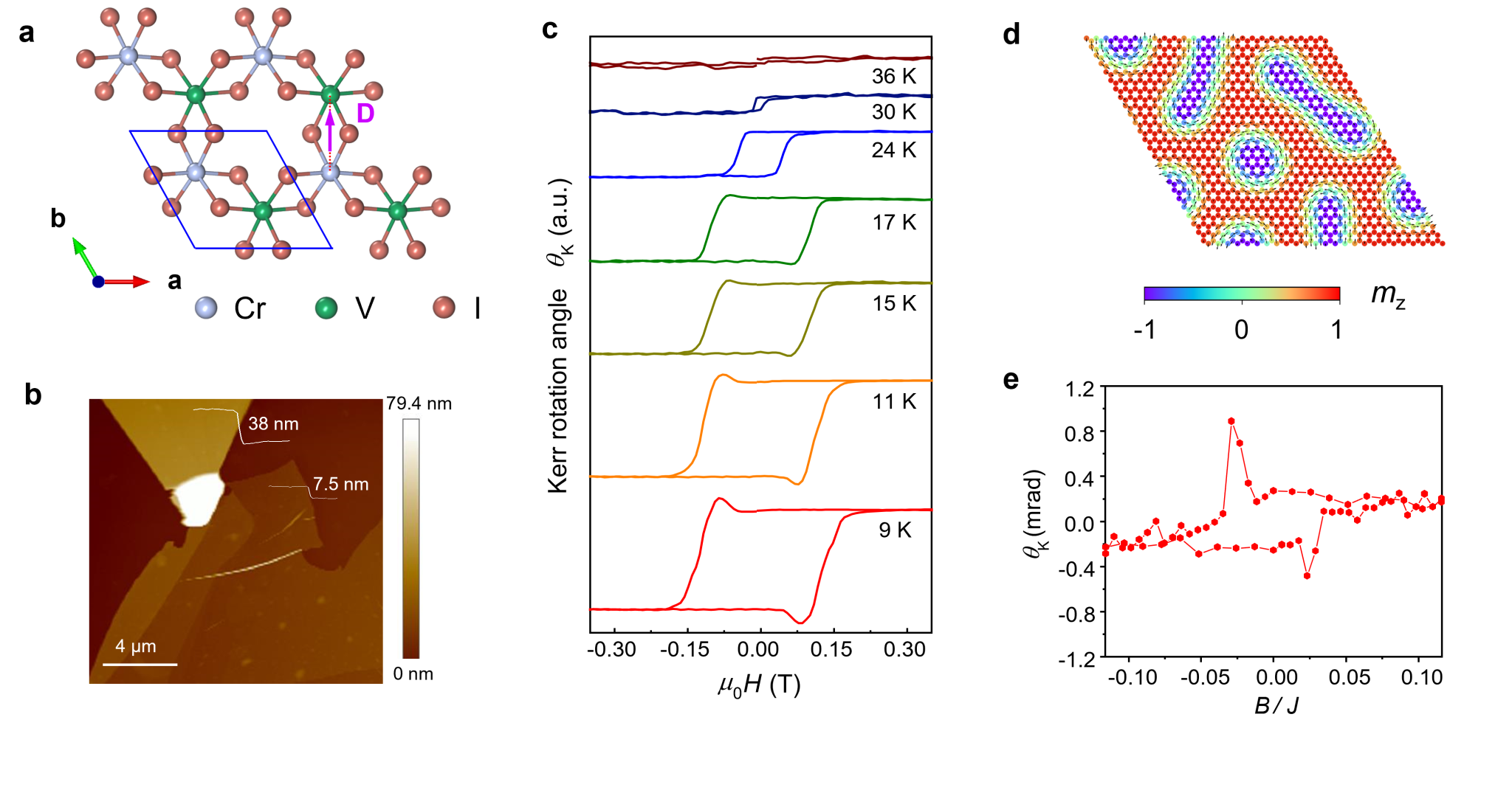 图1.展示与凝练“拓扑克尔效应”的材料体系与物理过程。(a)新型二维磁性材料CrVI6的空间反演对称破缺晶体结构及其DM相互作用示意图。(b)SiO2/Si衬底上的薄层样品的原子力显微镜图像,颜色代表样品不同区域的厚度变化。(c)不同温度下的磁光克尔回线,低温下展现出奇异反对称“凸起”。(d)理论模拟磁场辅助下的局域磁矩分布,展示出点状和条带状磁斯格明子。(e)理论计算的磁光克尔回线。
