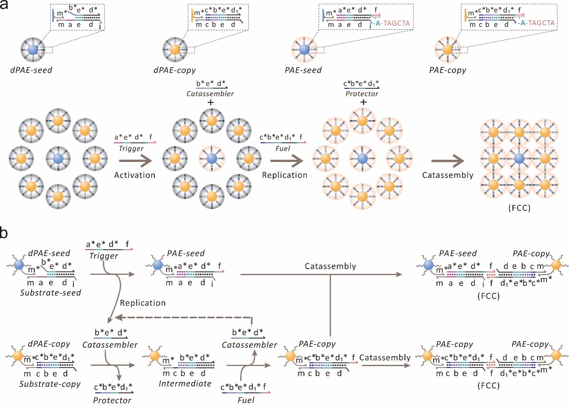 图1 DNA链替换催组装网络调控PAE种子复制及复制体组装过程示意图。