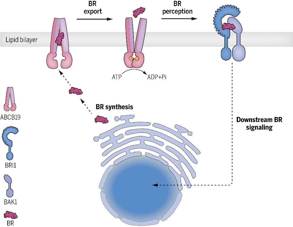 BR分子通过其信号通路发挥调节作用。目前,关于BR的合成、代谢以及信号转导过程已经有了一定研究。BR在细胞内部进行生物合成,但是却在细胞外被受体识别,从而引发下游信号。由于在合成过程中,BR分子被加上多个亲水基团,导致其直接通过扩散作用跨越细胞膜屏障的能力下降。它是如何从细胞内运输至细胞外发挥作用的,这一过程仍然未知,也是BR研究领域亟待解决的科学问题。