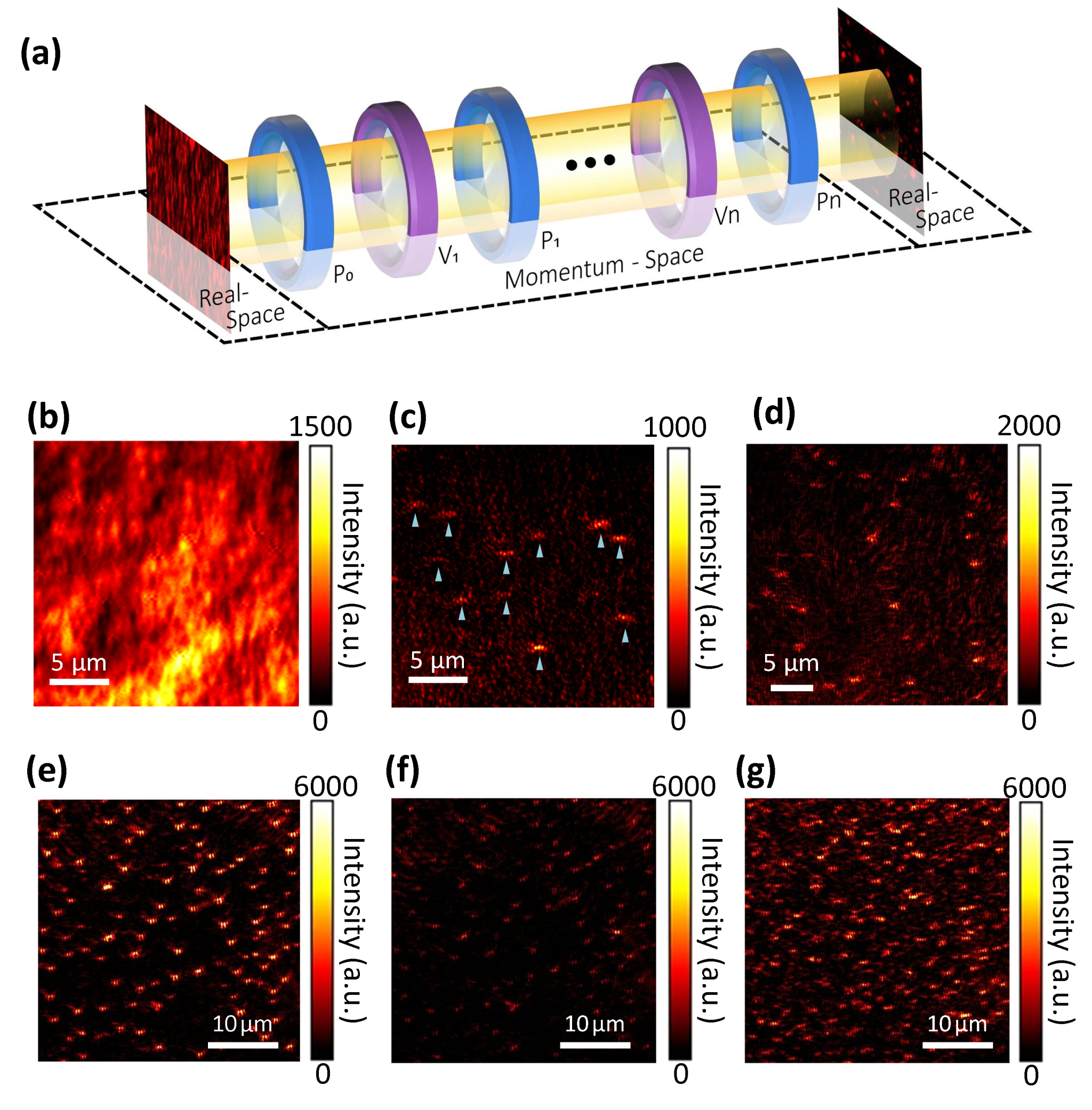为了解决这个问题,张斗国教授课题组设计并实现了一种动量空间偏振滤波器件(图1a所示,由偏振片Pi与涡旋半波片Vi组合而成),它可在动量空间进行矢量场偏振调控,大幅度过滤、抑制各类背景噪声,只有单个纳米尺度物体的光散射信号能透过该滤波器件,被探测器采集到,从而实现了单个纳米尺度物体的高对比度、高信噪比的成像探测 (无需图像后处理,实时呈现单个颗粒物的无标记、宽场光学像)。