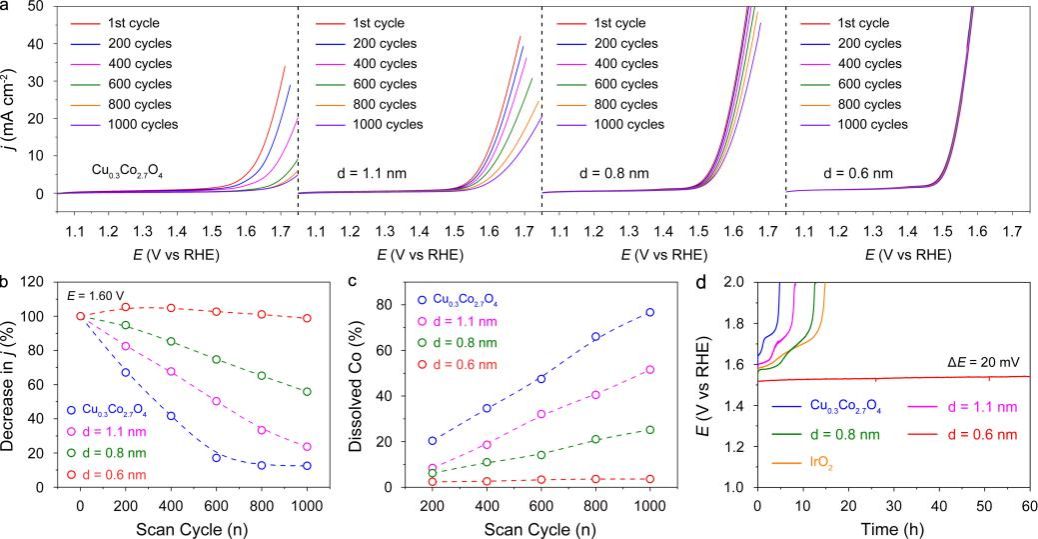 为了探究不同距离铱单原子对Cu0.3Co2.7O4的稳定效应,研究人员对系列催化剂进行了酸性电化学析氧稳定性评估。结果表明,随着铱单原子之间的距离从1.1 nm缩短到0.6 nm,催化剂的稳定性逐渐提高。当铱单原子距离为0.6 nm时,该催化剂在1000圈测试后性能仍然保持稳定(图2a,b),且电解液中几乎不存在溶解的钴物种(图2c)。此外,该催化剂在10 mA cm-2的电流密度下可以稳定运行60小时,表明其优异的稳定性(图2d)。