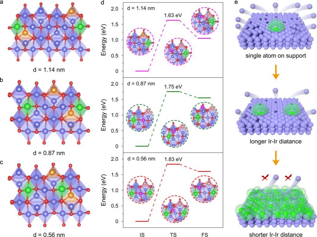 首先,研究人员建立了不同距离铱单原子的结构模型,研究了不同距离铱单原子对Cu0.3Co2.7O4中钴原子迁移能的影响。结果发现,随着铱单原子之间的距离从1.14nm逐渐降低至0.56nm,钴原子的迁移能从1.63 eV提升到1.83 eV(图1a,b,c,d)。以上结果表明,当铱单原子之间的距离较远时,其对Cu0.3Co2.7O4的稳定效应较弱;当铱单原子之间的距离足够近时,近邻铱原子对钴原子的稳定效应会相互叠加,从而稳定整个Cu0.3Co2.7O4催化剂(图1e)。