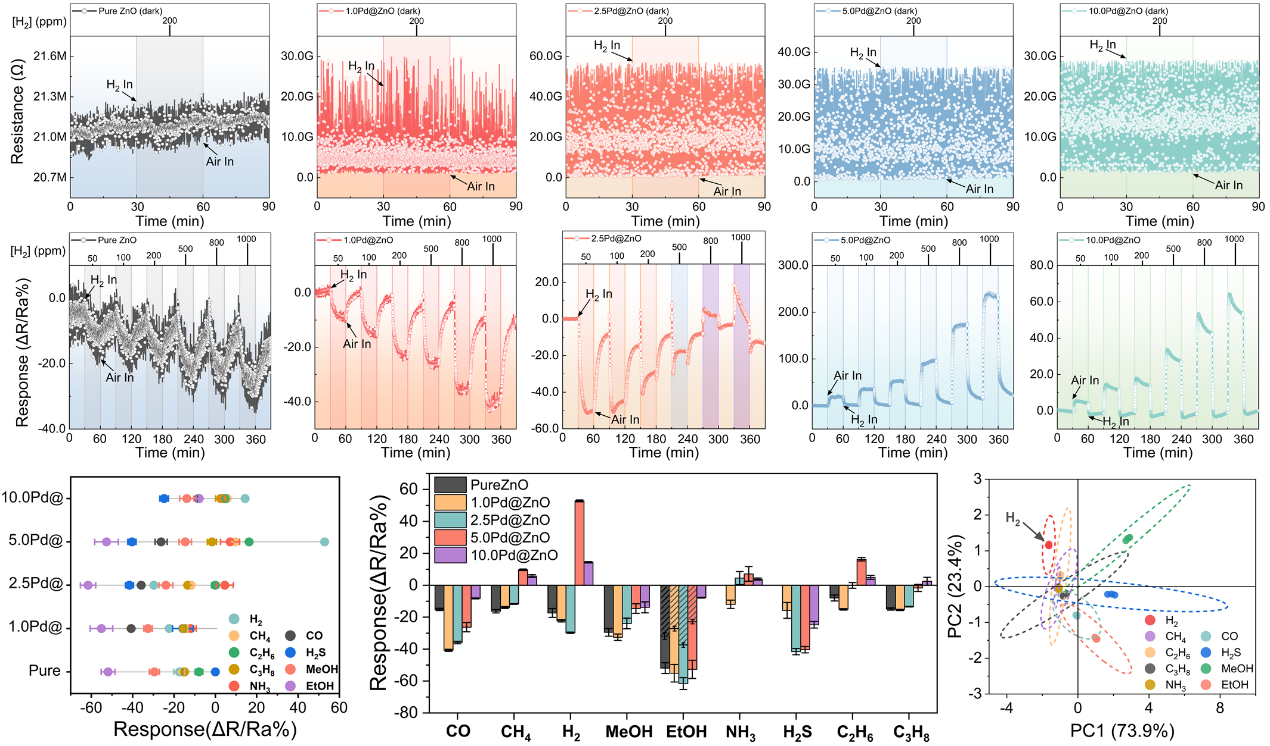 为解决半导体基传感器工作温度高与选择性差的难题,孙金华教授团队提出了一种从材料源头设计的有效方案,通过光激发巧妙地实现了材料表面的室温激活,同时借助优化热处理后Pd@MOF衍生金属氧化物半导体材料的多孔特性以及Pd纳米团簇对H2分子的特殊吸附机制,实现了单片传感器在室温下对氢气的独特高选择性响应。该工作利用信号模式识别方法发现传感器对氢气的响应与其他典型可燃气体的响应特性完全独立,这意味着仅基于原始电学响应信号即可实现对氢气的准确识别,从而摆脱了对复杂传感矩阵设计的依赖。