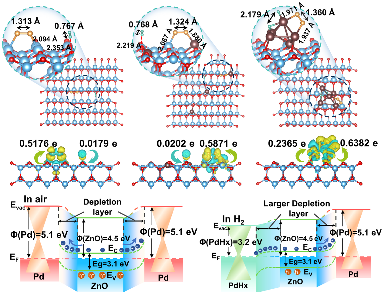 该研究工作还通过模拟实际传感过程,系统地开展了相关结构模型的DFT计算,并结合能带结构理论证明了不同Pd态表面O2分子和H2分子的特殊吸附行为。理论计算结果与实际实验中产生的n型向p型半导体响应特征的转变相吻合,为Pd元素在高选择性材料中的应用提供了更加深入的理论基础。