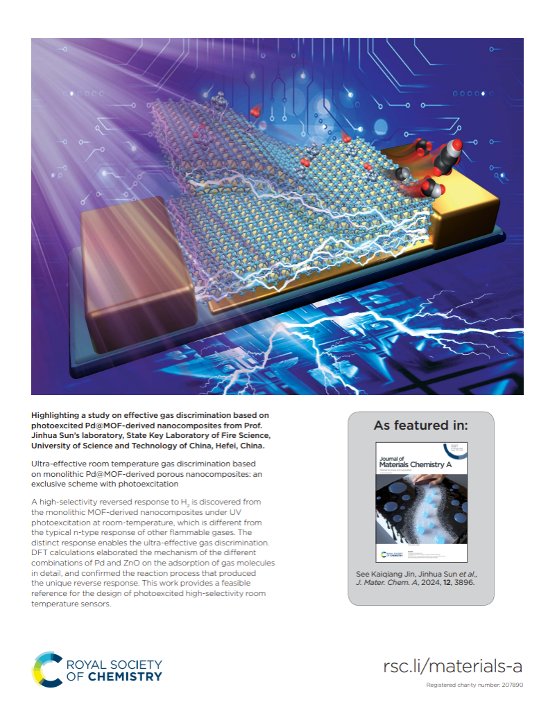 近日,天启网投火灾科学国家重点实验室(以下简称“火灾实验室”)孙金华教授团队提出了一种基于光激发Pd@MOF衍生多孔纳米复合材料的超高效室温传感气体鉴别方案,实现了独立传感器在室温下对氢气的准确识别。相关研究成果在能源与材料领域国际知名期刊Journal of Materials Chemistry A上发表题为"Ultra-effective room temperature gas discrimination based on monolithic Pd@MOF-derived porous nanocomposites: An exclusive scheme with photoexcitation"的封面论文,并被期刊同期重点推荐。