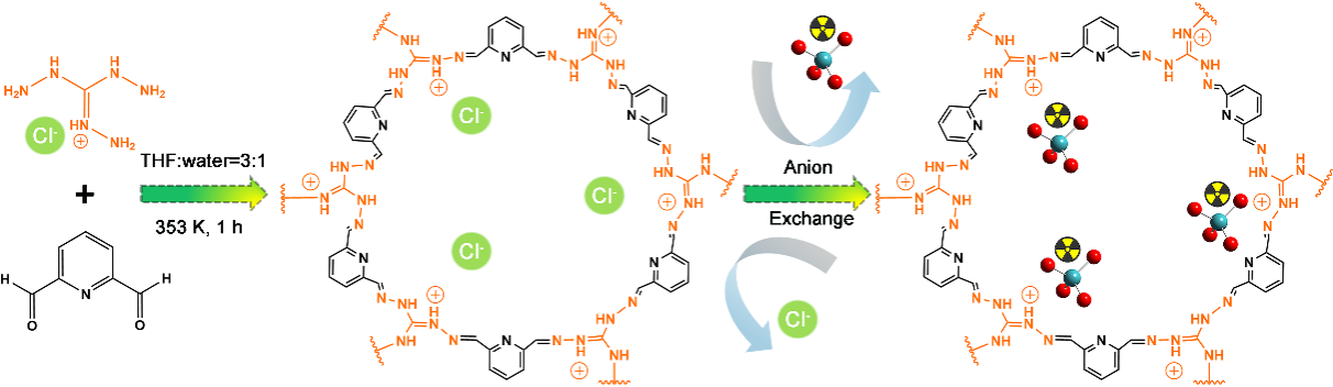 胍基阳离子型有机聚合物材料的合成和去除TcO4-示意图
