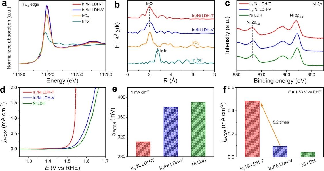 根据电化学沉积原理及X射线吸收精细结构表征结果,Ir1/Ni LDH-T在Ir位点与Ni LDH的配位氧之间具有更多的共价键,且Ir1/Ni LDH-T的Ni 2p XPS峰向高结合能偏移,表明Ir1/Ni LDH-T中Ir单原子具有更强的金属-载体相互作用。电催化水氧化反应测试结果表明,具有强金属-载体相互作用的Ir单原子催化剂的质量活性和本征活性分别提高了19.5倍和5.2倍。