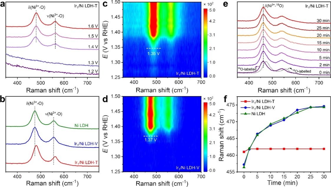 氧同位素标记原位拉曼光谱表明,在水氧化反应过程中,Ir1/Ni LDH-V和Ni LDH中的18O标记氧很容易与电解液中16O原子交换,表明这两种催化剂中Ni是主要的活性位点。而Ir1/Ni LDH-T中18O标记的Ni3+-O不会被16O交换,表明Ir是主要的活性位。此外,理论计算揭示了Ir1/Ni LDH-T中更强的MSI优化了含氧中间体的吸附能,从而提升了反应性能。