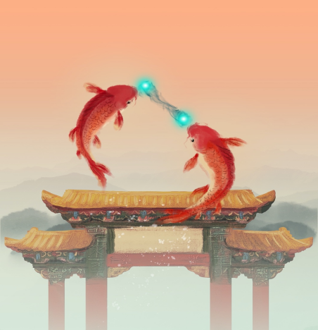 图1:图中头顶玉珠的两条鲤鱼,象征着一对自旋相反的费米子;龙门代表了超流相变和赝能隙。鲤鱼跃过龙门,表明配对发生在超流相变温度以上。这种配对现象反过来又导致赝能隙的出现。/制图:陈磊