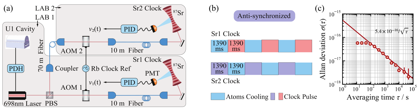 图1 中国科大Sr 1和Sr 2光钟的异步比对操作和稳定度性能