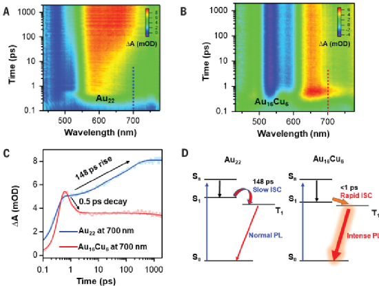 通过瞬态吸收光谱进一步研究其激发态动力学发现,两种团簇的发光态均来自于三重激发态(T1),且在飞秒瞬态吸收光谱中观察到了不同的动力学过程。在380nm激发下,Au22表现出148 ps的上升过程,而Au16Cu6表现出0.5ps的快速下降过程。通过三重态敏化实验证明,这两个过程可以归属于S1→T1的系间窜跃(ISC)。由于铜掺杂使得Au16Cu6具有更小的∆EST,因此显著加快了其ISC的速率,最终Au16Cu6展现出接近100%的PLQY。