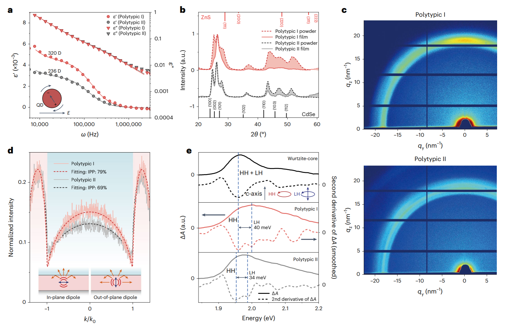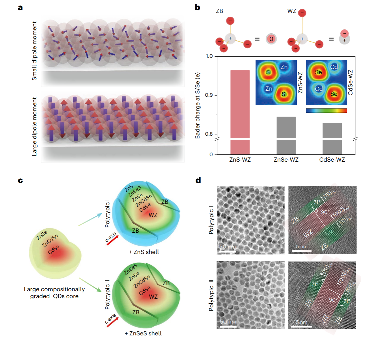 在本项研究中,研究人员开发出一种新型的多型晶体结构的量子点,使用纤锌矿CdZnSe核作为结构模板来外延生长纤锌矿 ZnS壳层,得到了纤锌矿与闪锌矿ZnS共存的多型晶体结构量子点。强离子性的纤锌矿ZnS提供了排列量子点所需的大电偶极矩;闪锌矿部分影响电子结构,从而促进每个量子点的取向发光,两方面结合实现了跃迁偶极矩取向的调控。