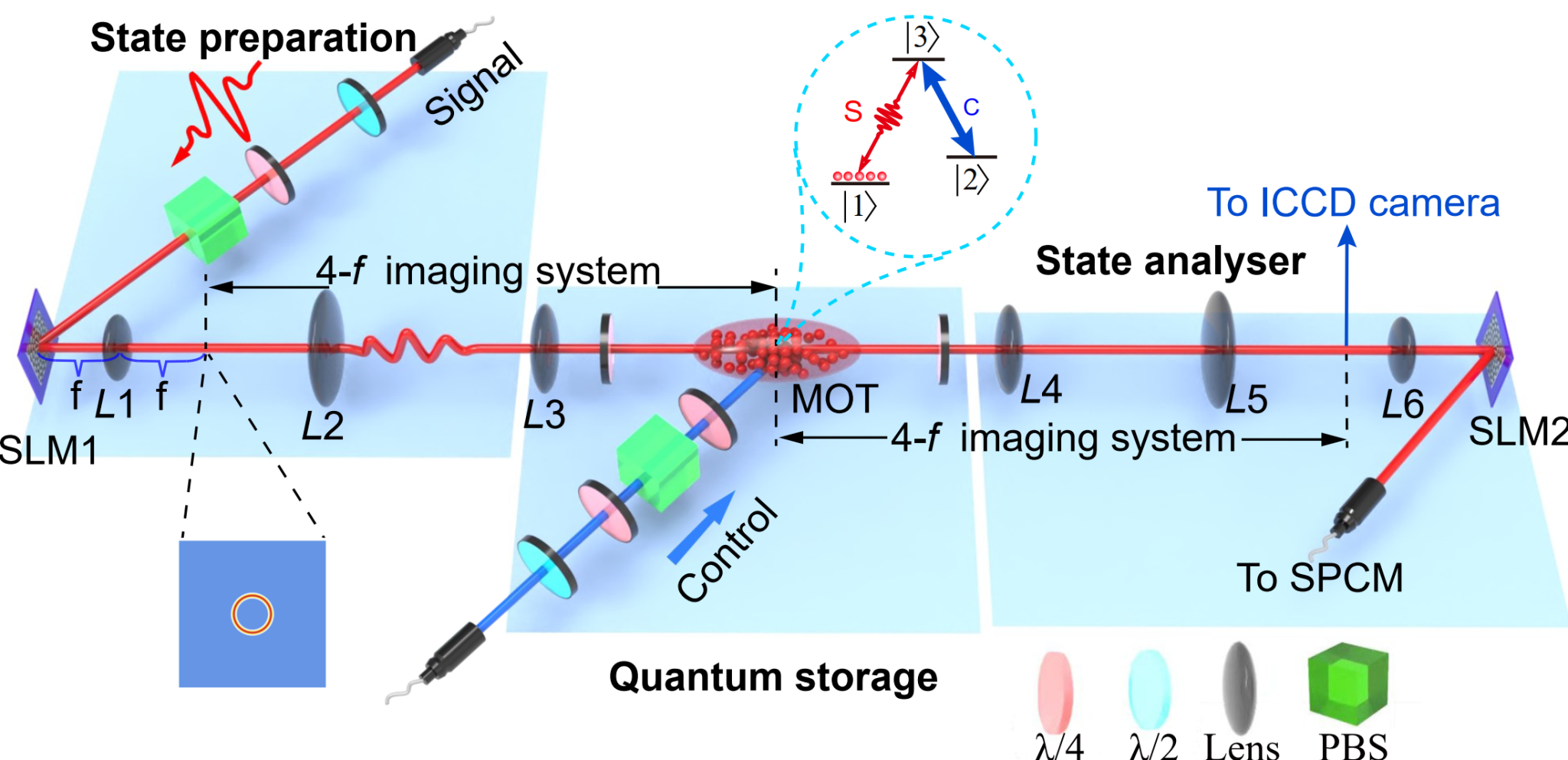 为了解决这一难题,近年来史保森教授带领的科研团队开展了高维量子存储器的深入研究,在以前研究进展的基础上,最近他们利用通过激光冷却与囚禁技术获得的大光学厚度的冷铷原子团作为存储介质,以完美涡旋光作为信息载体,并采用轨道角动量作为信息编码自由度,利用完美涡旋光的横截面大小与轨道角动量拓扑荷数无关的特点,实现了25维的光量子态存储,效率达到60%。由于该存储器对25个轨道角动量模式态具有相同的存储效率,因此不仅可以存储一个25维量子态,也可以对一个由25个轨道角动量模式任意组合的高维量子态进行高效率存储,显示出对任意可编程量子态的兼容能力,因此该结果在实际量子通讯中具有重要应用价值。
